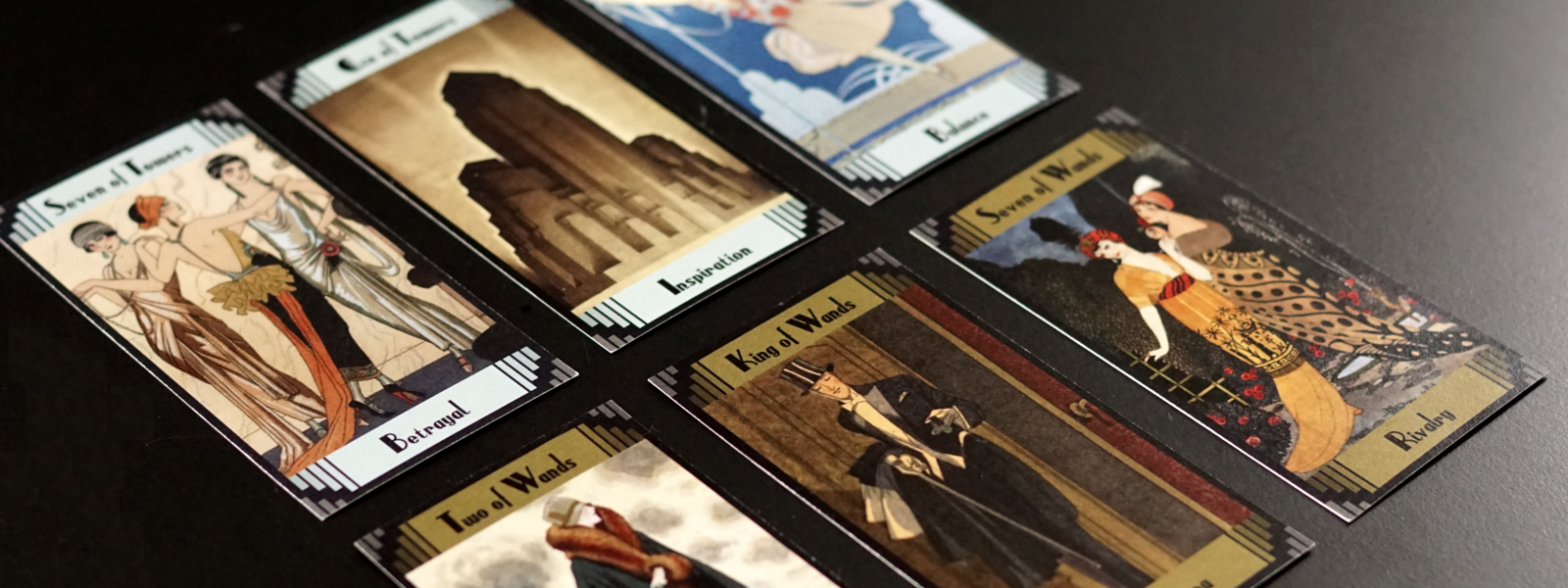 This deck draws primarily from the work of two artists of the period, Erte and Georges Barbier. Both were instrumental in defining the 1920s and 1930s as an era of extreme androgyny, outrageous poses, and outrageous lifestyles. Many of the additional contributors were colleagues of Erte and Georges Barbier and graduates of the Ecole des Beaux Arts. Many also worked with the visionary fashion designer Paul Poiret.