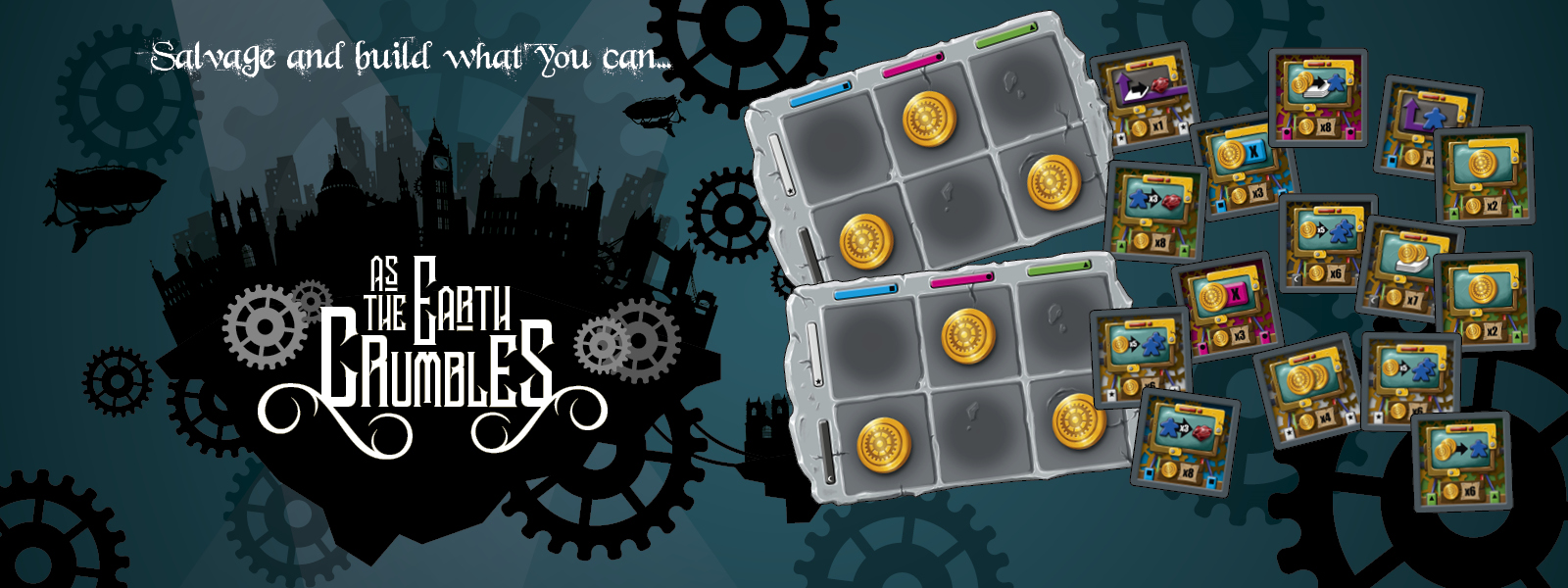 As the Earth Crumbles is a post-apocalyptic, steampunk, tile-taking engine-builder. Each turn, players must salvage ruins from Earth's surface, gaining resources that can be used to build their own independent island cities. With every tile determining the income not only for yourself, but for your competitors, you must race to earn the coin needed to fund your expansion. However, take heed- the key to your longevity may lie not in the heft of your purse, but in preserving the culture and the prosperity of those who have sought salvation on your floating sanctuary.