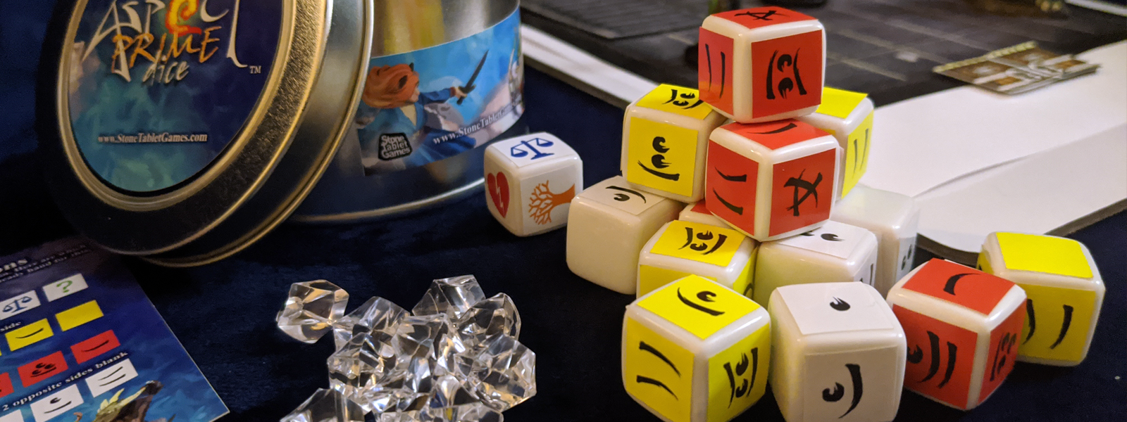 This dice set comes with a storage tin and instructions on how to label the dice and tin. If you want the extra large ones shown in some of the below images, hop on over here.