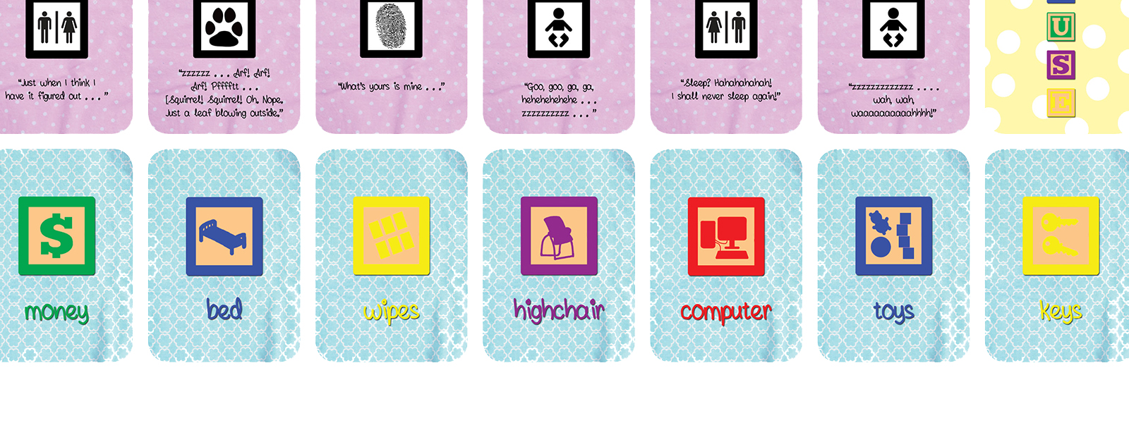 Inspired by Rummy, Bang!, and the challenge of being a real life parent, Baby in the House is a Goal Achievement game where players must try to reach 5 Achievement points for their designated Role(s): Baby, Burglar, Dog, Parent, or Teenager.