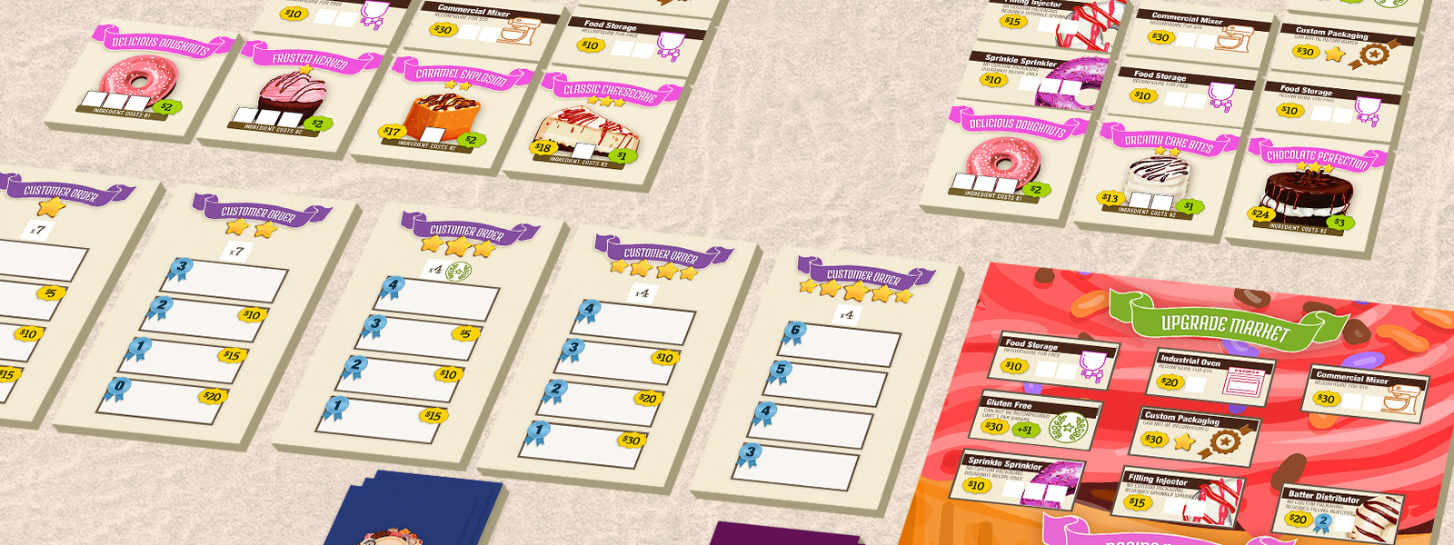 Welcome to Baked, a resource management game where players take on the role of a lead baker seeking to build the biggest baking empire! Players compete by acquiring new recipes, expanding their production and racing to complete customer orders for victory points. Each game the order requirements and modifiers change ensuring that no two games are exactly the same. The player with the most victory points wins!