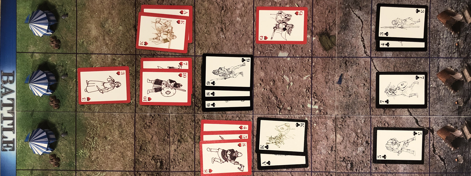 Battle Ace is an easy to learn, chess-like strategy game where you move, stack and attack with your cards to wipe out the enemy, take their king or invade their stronghold. The card warriors and zombies have different combat values and movement rates and can be stacked (with limits) to become a more powerful fighting force. The pace is kept quick with alternate, one-action turns and you are engaged the whole time working out your strategy and trying to assess your opponent’s next move. There are a number of optional rules available which add in some more randomness, terrain features and new warriors etc (all using a deck of normal playing cards). An extra one or two players can enter the fray by simply adding a second suit of the same colour to each side and expanding the battleground (two decks will be needed for this).