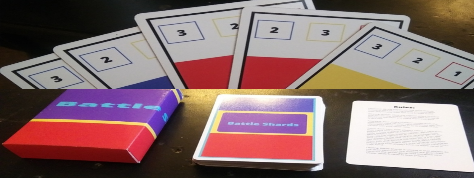 When your attack depends on the color of your solid block (red, yellow or blue), against the number that matches your opponent's square for that color (1, 2 or 3), you are playing a quick, fun-filled and easy to learn and play, but hard to master battle card game called Battle Shards!