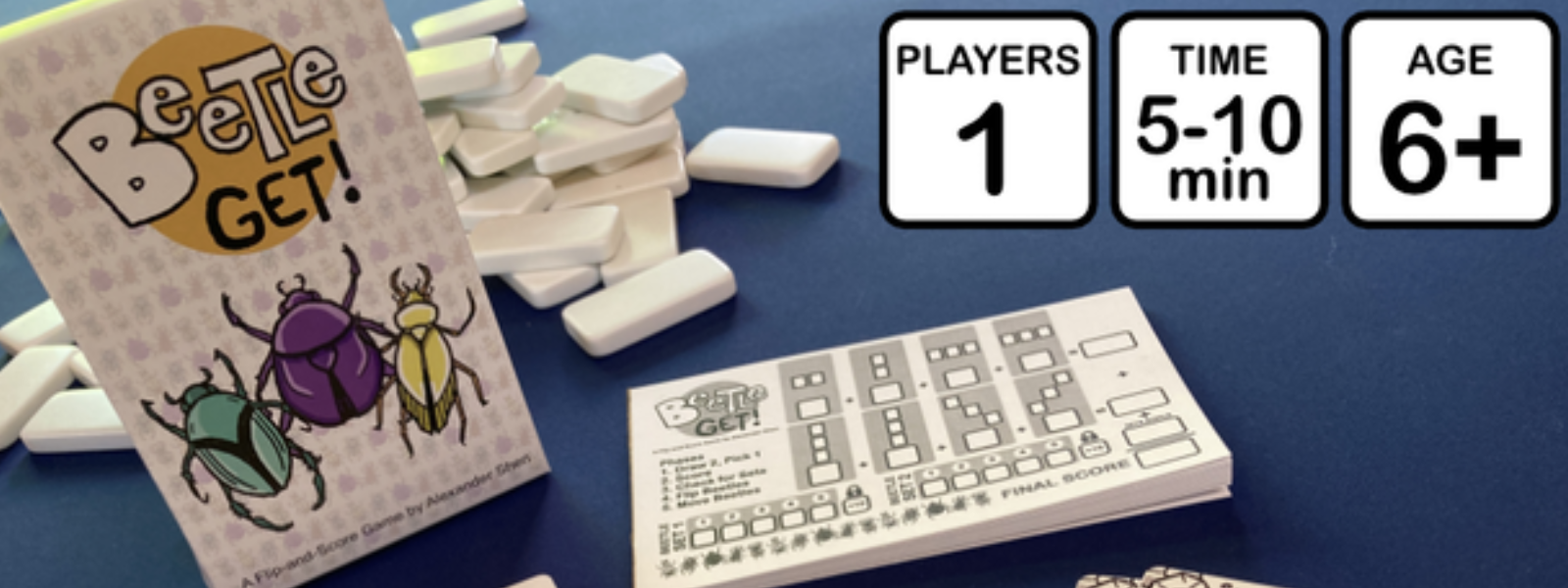 Beetle Get! plays up to 1 and a game can be completed between 5 to 10 minutes. The game mechanics themselves are fitting for 6+, but the strategy on which patterns to use now, when to use later, which to sacrifice to get beetles to be face up, are all things that can get the brain chugging along for more seasoned players.