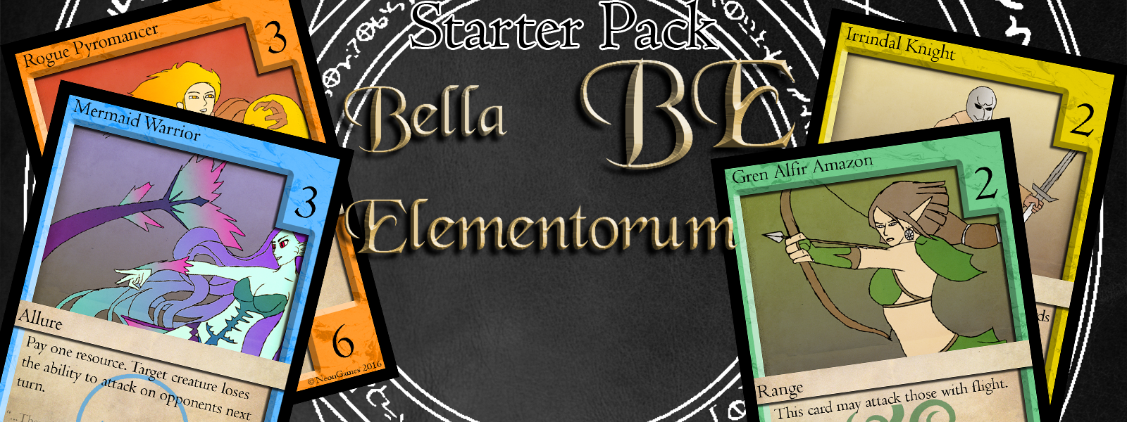 Welcome to BE: Bella Elementorum. This starter pack includes 60 cards of various basic elements, enough to construct two 30 card decks and start playing BE with your friends! Or one 60 card deck. I won't judge you for your stinginess.