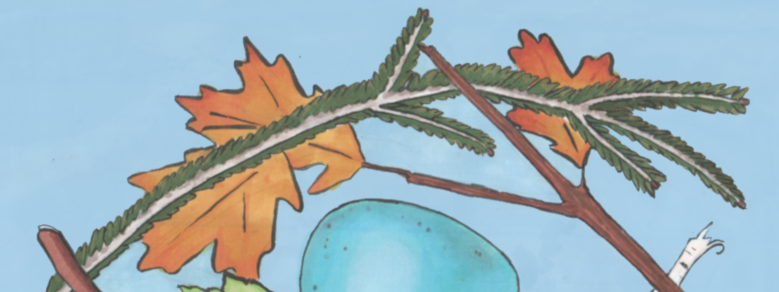 A deck of standard poker cards. Four suites, 10 pip cards and 3 face cards per suite and two Jokers and a blue background with branches and an egg. The images are all hand-drawn.
