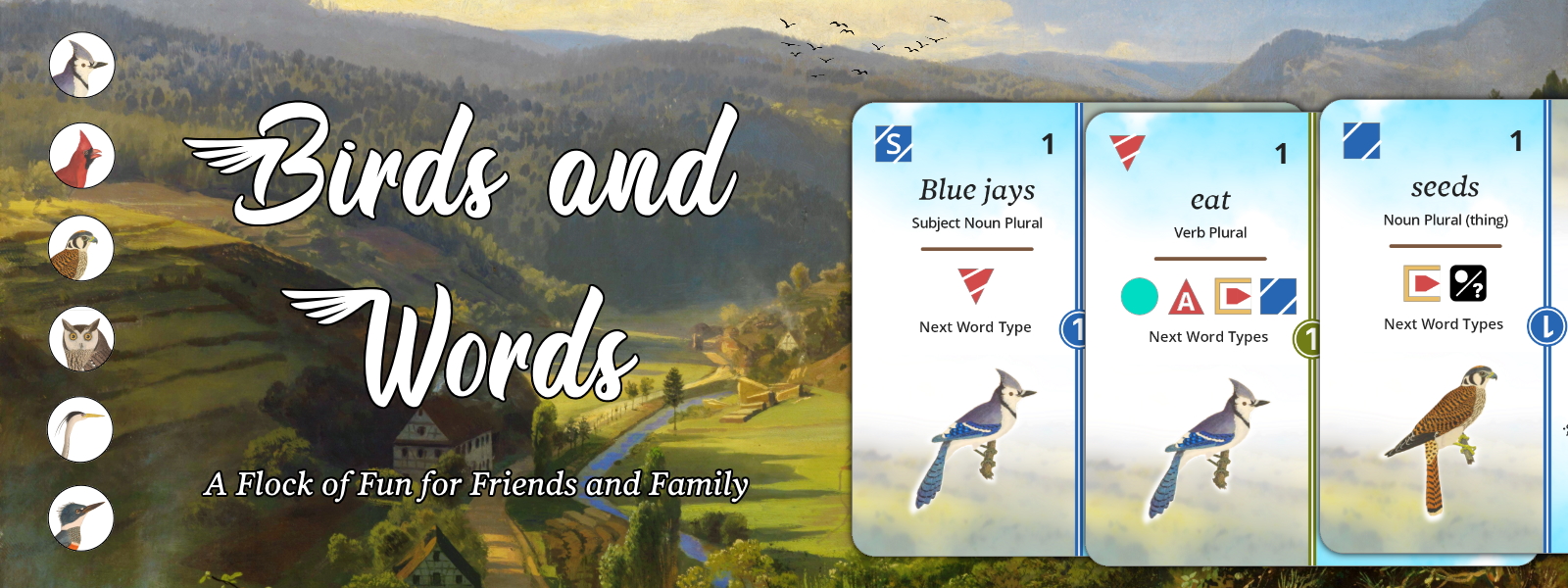 Besides being easy and fun for beginner readers and English language learners, Birds and Words uses the 5 parts of a sentence and the 8 parts of speech. It's an ideal activity that complies with many national and state English curriculum standards. See the Educator's Guide for more details. Players using both card levels learn about the 4 verb types (transitive, intransitive, linking, helping), nouns as subjects and direct objects, adverbs and adjectives, relative and personal pronouns, and conjunctions. English's core sentence patterns are front and center during gameplay. Birds and Words makes learning English grammar a fun, creative, and rewarding personal achievement event.