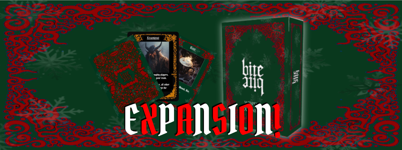 THIS IS AN EXPANSION FOR BITE: THE VAMPIRE CARD GAME. THIS EXPANSION INCLUDES 6 NEW ROLES, A NEW KRAMPUS DECK, AND A NEW TYPE OF CARD, NAUGHTY OR NICE, FOR PLAY WITH THE KRAMPUS. ADD AN EXCITING YULE-TIDE TWIST TO YOUR BITE EXPERIENCE. A COPY OF BITE IS REQUIRED TO PLAY THIS EXPANSION.