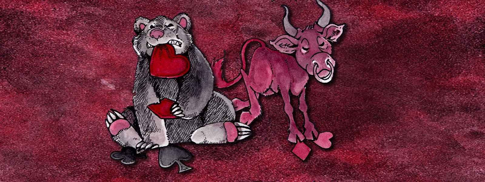The deck features historical-themed ink and watercolor cartoons for all the face cards and aces, with a bull and bear for the Jokers.