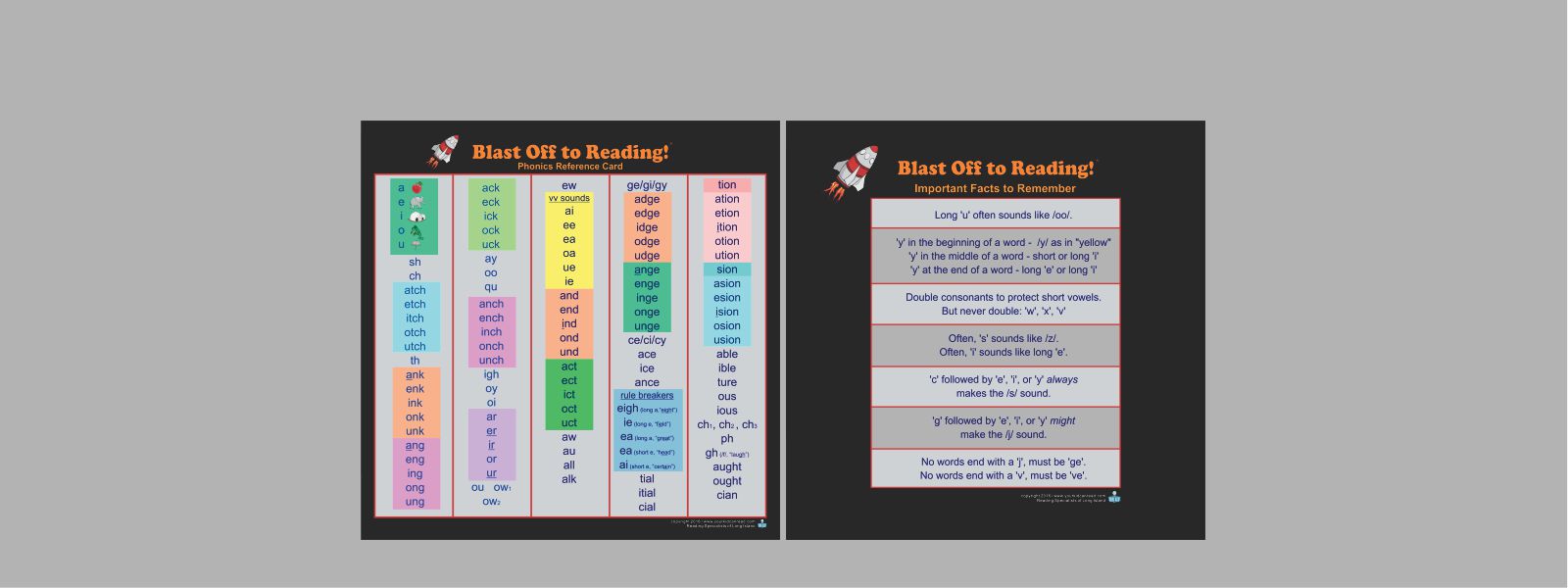 This 10"x10" double sided card contains all of the sounds of our language in the order of frequency, which follows our reading programs (Blast Off to Reading and A Workbook for Dyslexics). Use this card for a quick review of phonics sounds and rules before your reading lesson, or use this to help your student when writing.