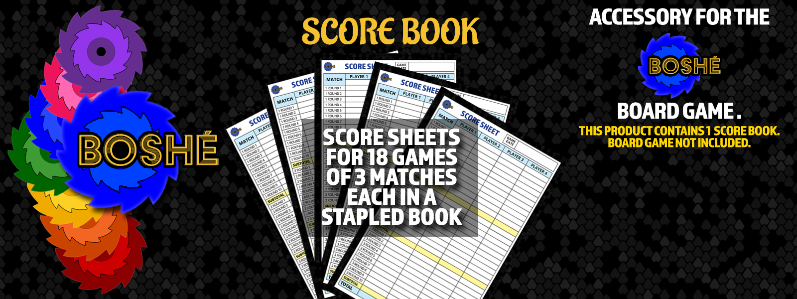 This product is an add-on for the BOSHÉ premium board game from Worlde of Legends™. It contains one 5"x8" staple-bound booklet consisting of 18 score sheets for the BoSHÉ game.