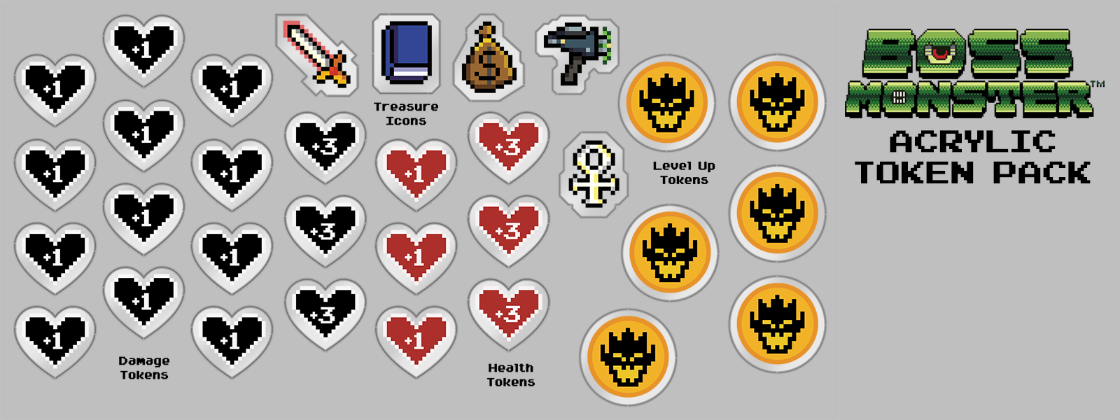Created by Brotherwise Games for our 10th Anniversary celebration, this acrylic token set isn't required for play, but is a great way to upgrade your Boss Monster experience! High-quality acrylic tokens make it even easier to track bonus hearts, treasure icons, and your Level Up status!