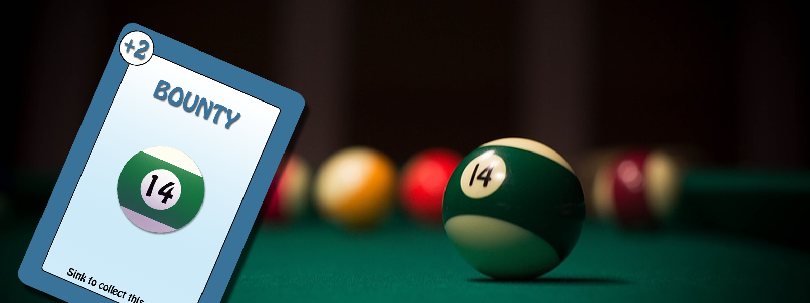 | 2) Take turns shooting pool. You get one shot and you don’t need to call it. If you sink any ball, draw a Score Card and read it aloud. If the ball was your secret Bounty Ball or one of the two public Bounty Cards, collect those points as well. |