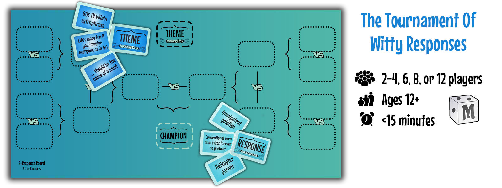 The goal of this tournament-style game is to find the champion that best fits the Theme. Players will choose Responses to face off against their opponents, then vote for the most fitting one!