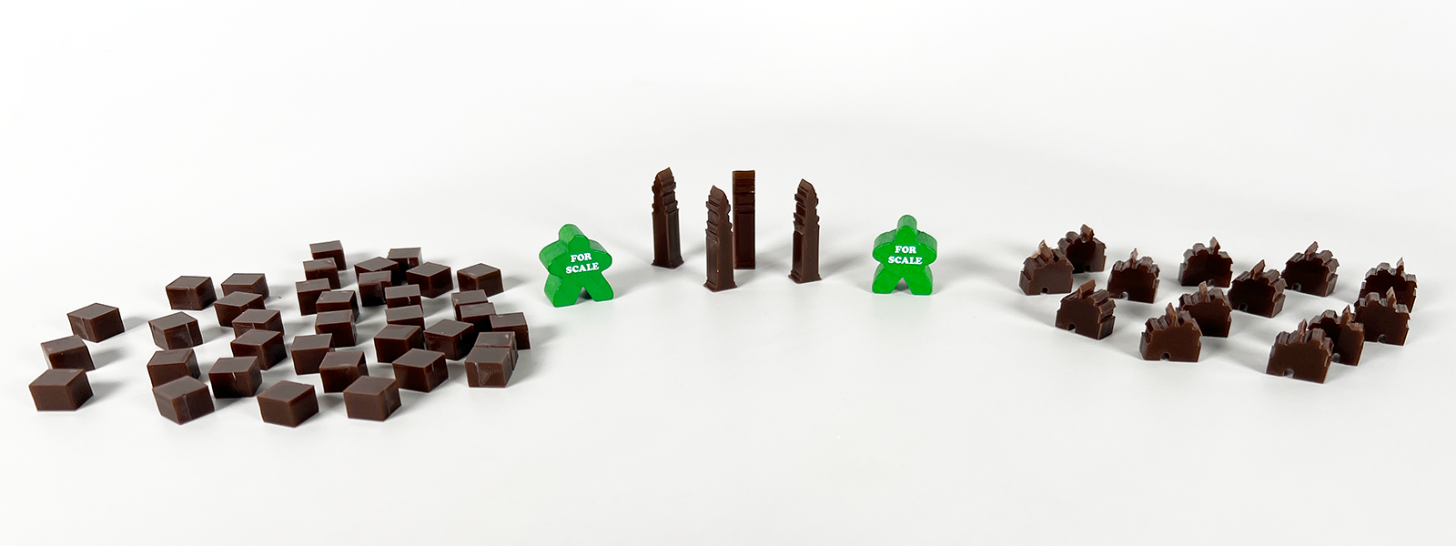 This is a complete set of the tokens needed for The Guild of Merchant Explorers (TGOME). It includes 13 villages, 4 towers, and 36 explorers all in the player's color.