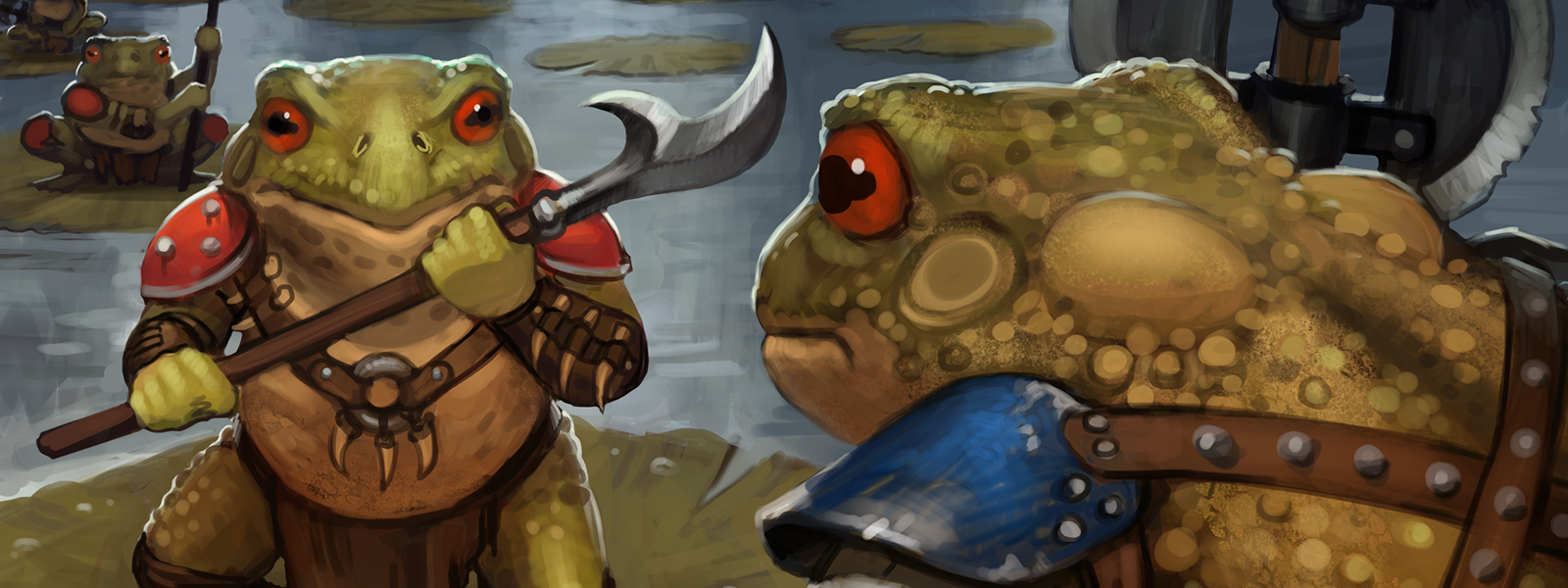 Weapons clash, water splashes and the booming battle cries of armored bullfrogs ring out across the moonlit swamp. Amphibian armies leap from lily pad to lily pad in their desperate struggle to win control of the pond.