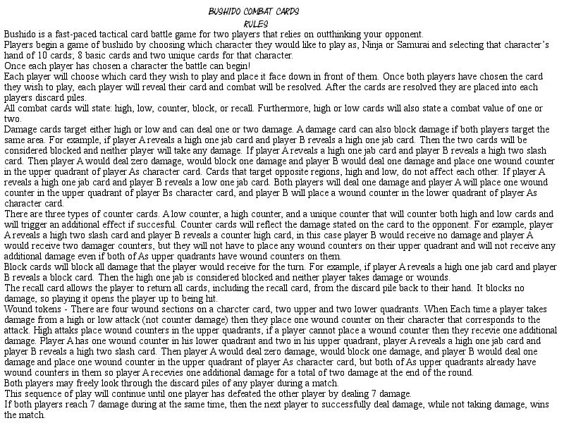 Bushido is a two player card battle game that relies on being able to outwit your opponent and anticipate their every move. Each player will assume either the role of the honorable samurai or the cunning ninja. Each of these unique roles have their own distinct advantages that they can leverage to get the edge in combat over their opponent; however, it will be up to the players to best utilize the different but equally powerful tools that are made available to them. There is very little luck involved in a game of Bushido. The player with the better decision making and that can stay steps ahead of their opponent will surely win the day!