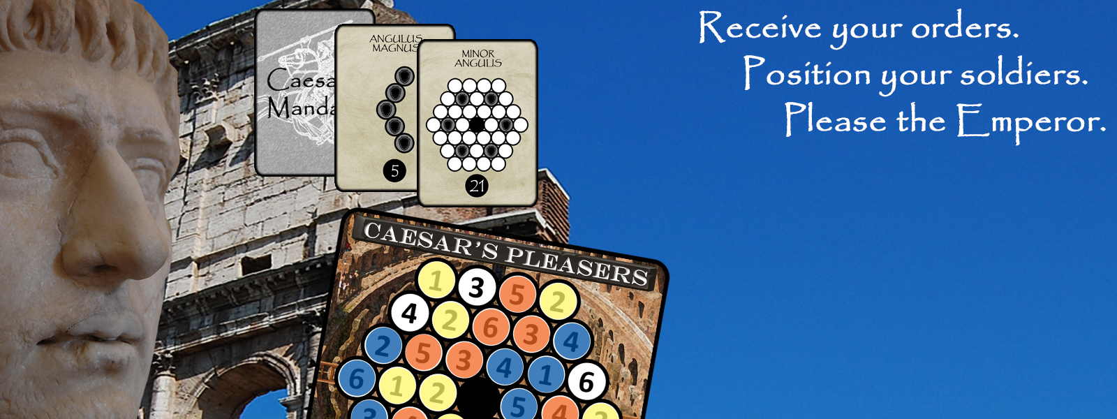 Caesar's Pleasers uses a familiar theme to introduce non-gamers to many of today's modern gaming mechanisms such as dice drafting, hidden goals, player interaction and game variants. The dice provide a touch of luck, but as the game progresses, players choose their own path, balancing risk and reward through the patterns they choose and deciding for themselves whether they focus on their own mission or seek to disrupt those of their opponents.