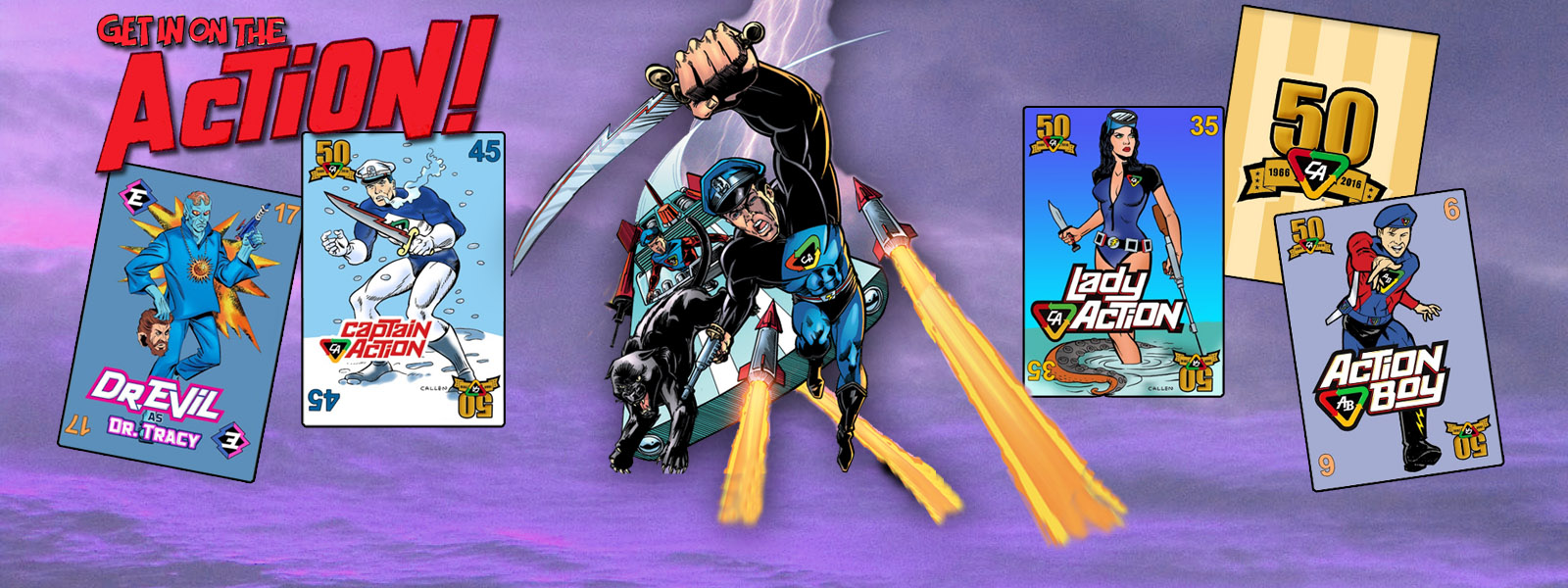 This new card game celebrates the 50th anniversary of the first superhero action figure, Captain Action. The game features all the characters from the Captain Action mythos: Action Boy and his pet black panther, Khem, Lady Action and the diabolical Dr. Evil.