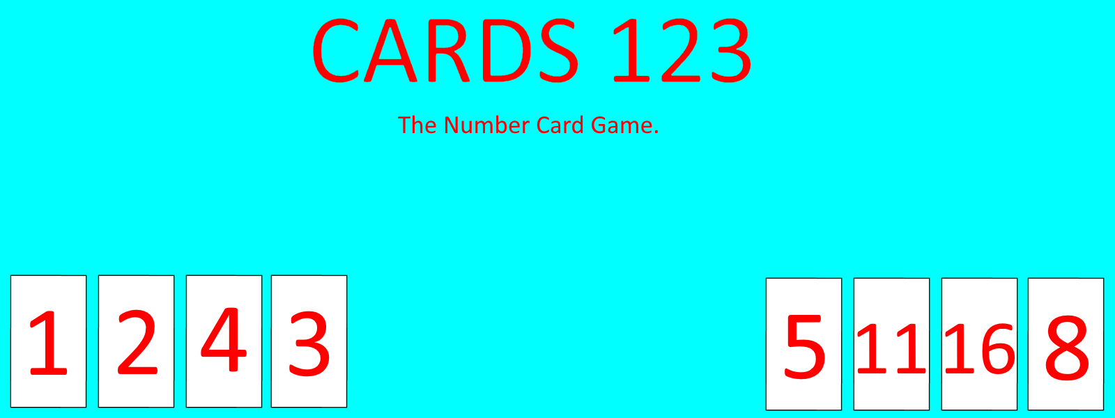 Cards 123 (pronounced Ka:ds 1 2 3) is a card game that is similar to the popular card game "Snap" where you get 4 cards and at first, hide the cards then when all players are ready all players say "CARDS 123!" and the person who has the cards with the numbers 1,2 and 3 wins the round or game depending on how you want to play it. I have been planning on making these type of games for a couple of years so it will be nice to make it into a reality.