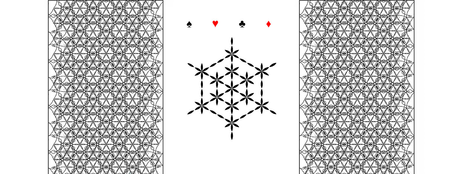 This deck is a revised 52 card deck using aspects of dice and dominoes. Based in principals of sacred geometry, each card simultaneously represent a face on multiple platonic solids. There is an added boarder on the top and bottom representing the pip number and the associated organization of that valency contrived for this deck. The cards are designed to make space-filling patterns when adding to 7 or 13 - just as the opposite side of cube or dodecahedron dice. It can be used as a common card deck just as well. There are no instructions necessary although there are illustration and instructions for original games and puzzles online and as pdf. This is intended to be an open ended game system to creatively engage its users.