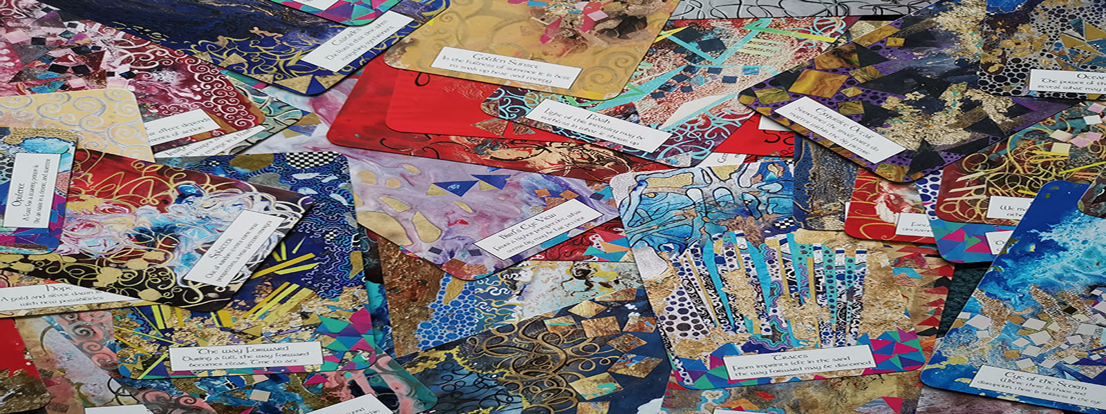 This deck was created from 40 mixed-media collage artworks made from paper, each A4 in size. They involved a process of psychic automatism,where images were allowed to emerge subconsciously in the main, complete with marbled flows of intense colours and geometric patterns superimposed on these.