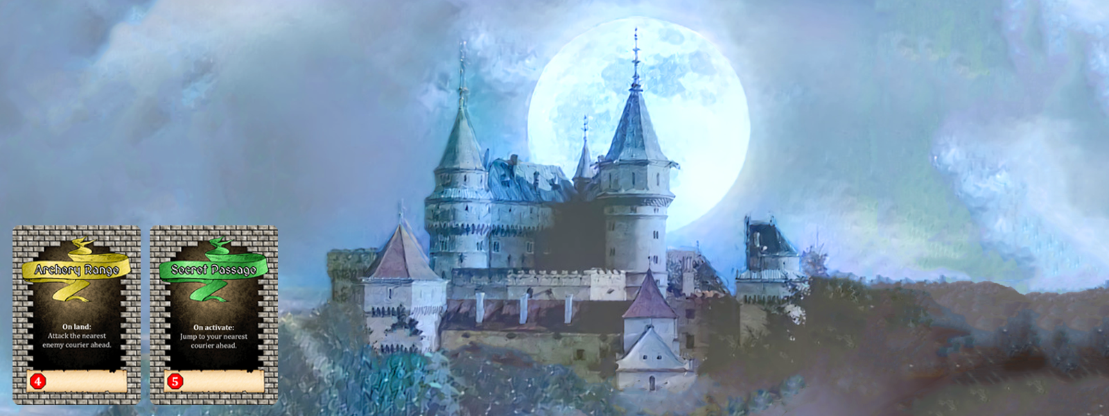 Castle Couriers is a card and dice game played on a board that’s different every time you play. To carry a valuable message to the king, you must maneuver your couriers through a labyrinthine castle full of staircases, trapdoors, secret tunnels, and revolving fireplaces. Watch out, lest your rivals ambush you from the shadows, snipe at you from afar, or lure you astray with the delectable smells of home cooking. Onward, friends! Onward to riches and glory!
