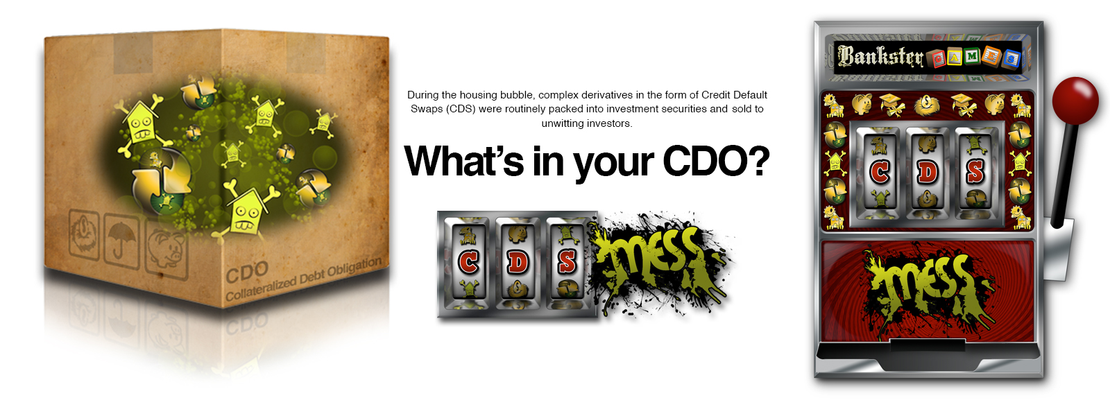 In this game, you take on the role of an investment bank, package debt into Collateralized Debt Obligations (CDO) and then sell it to unsuspecting investors. Protect yourself against losses or bet against the health of another bank using Credit Default Swaps (CDS). This game is about maximizing profits no matter what and, when necessary, getting bailed out by the government. In CDS Mess, you too can be Too Big To Fail!
