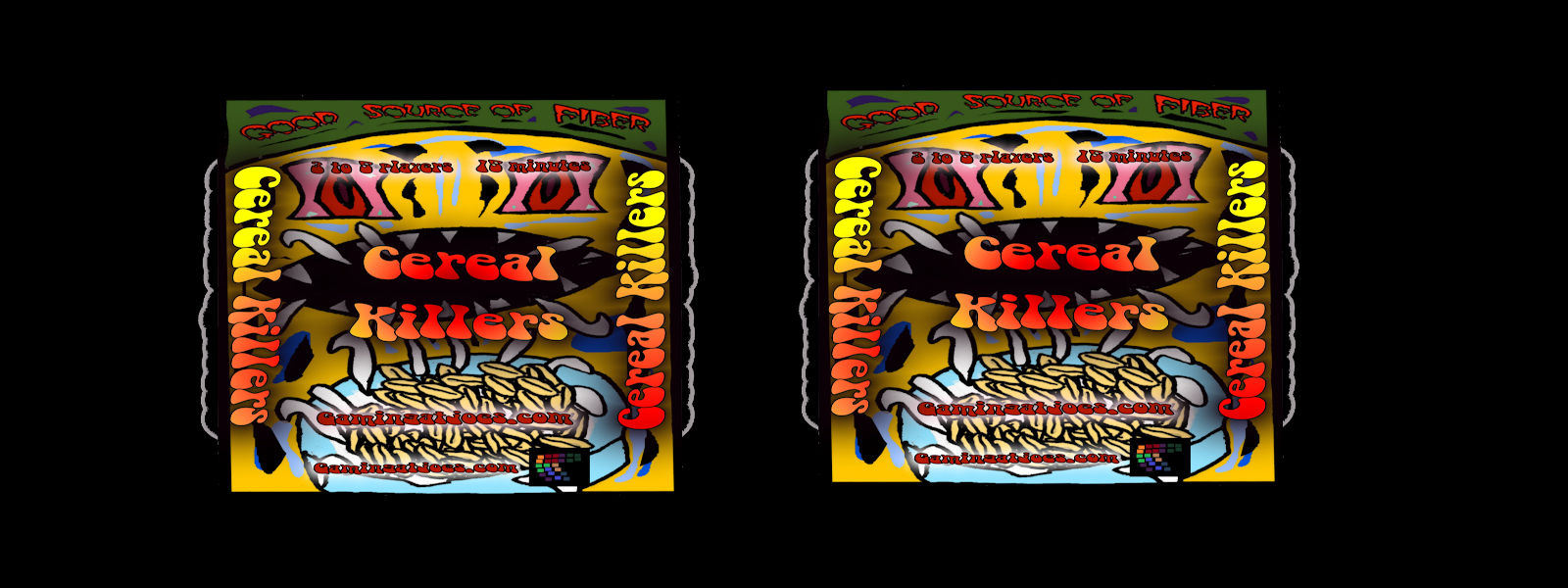 Cereal Killers, a player vs. Player vs. Cereal Box Monster card game. Players will play weapon cards to either fight the monsters and gain cereal points or effect the other players, to cause the monster to harm them and make them lose cereal points.