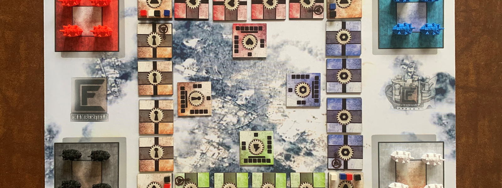 The medium neoprene mat for Chamberfield is an option to keep the play area organized and enhance the sky setting. The four colored landing pads can be used for airships or to place player decks, it is up to the players.