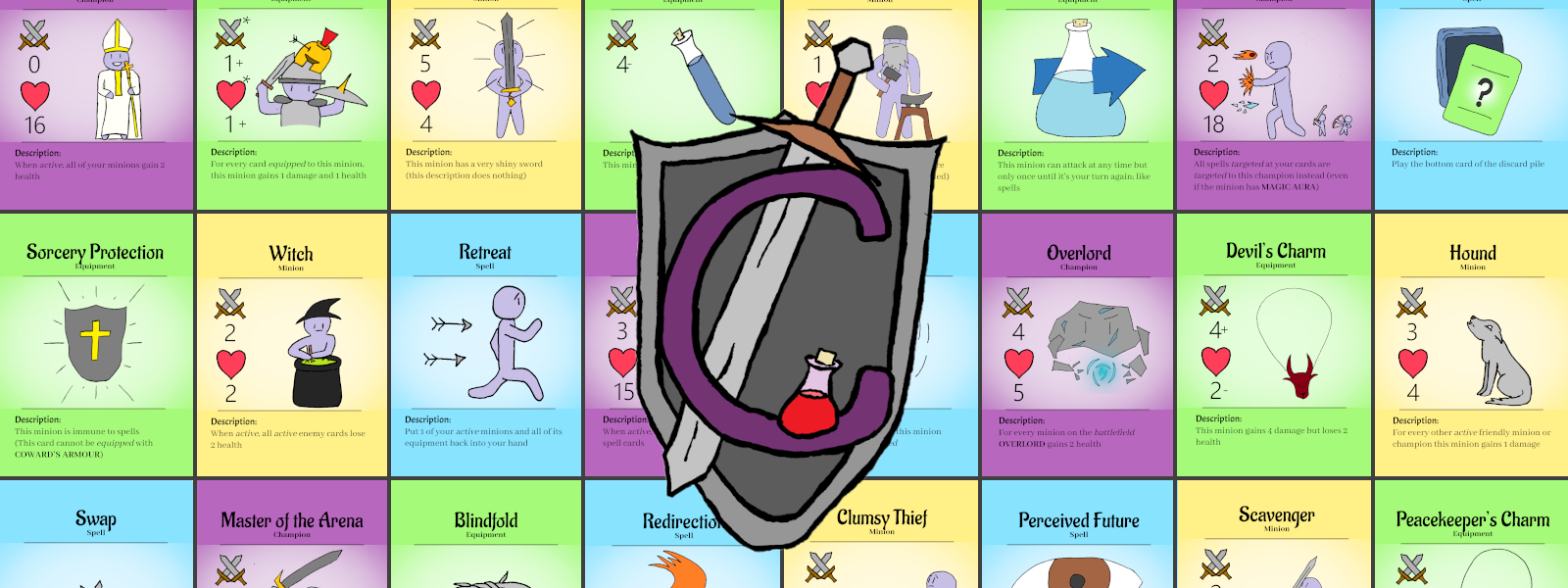 Every copy of Champions includes a tuck box to hold the contents, a game rules booklet showing the basics of the game, and 104 specially designed cards. The 104 cards are split into four different card types: Champions, Minions, Spells, and Equipment. In total, there are 12 Champion cards, 32 Minion cards, 31 Spell cards, and 31 Equipment cards.