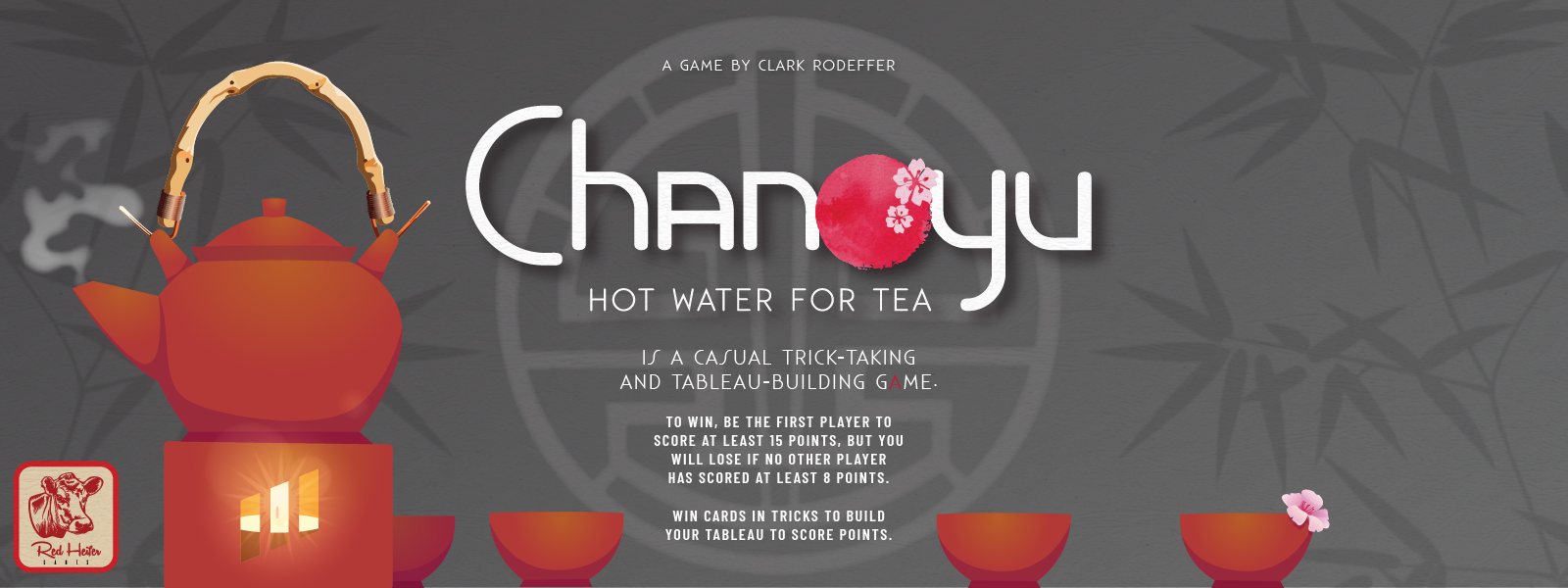 Chanoyu is a casual trick-taking and tableau-building game. To win, be the first player to score at least 15 points, but you will lose if no other player has scored at least 8 points. Win cards in tricks to build your tableau to score points. Face cards cannot take tricks, but when taken, face cards may be added to either end of the trick winner’s tableau as a substitute for any numbered card. Playing a face card to a trick represents opportunities to give face. Tsukumogami cards also cannot take tricks, but when taken, they may be added anywhere in any player's tableau.