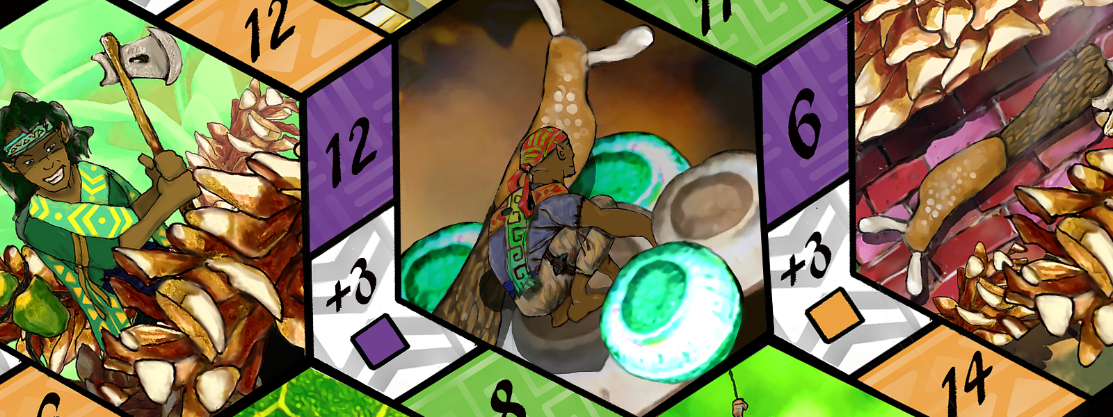Chevrondel is home to the Delves and their insect companions known as Creepers. Players try to gain hex task cards to upgrade their rondel or gain chevrons, (victory points). The first to gain 6 chevrons triggers the game's end.