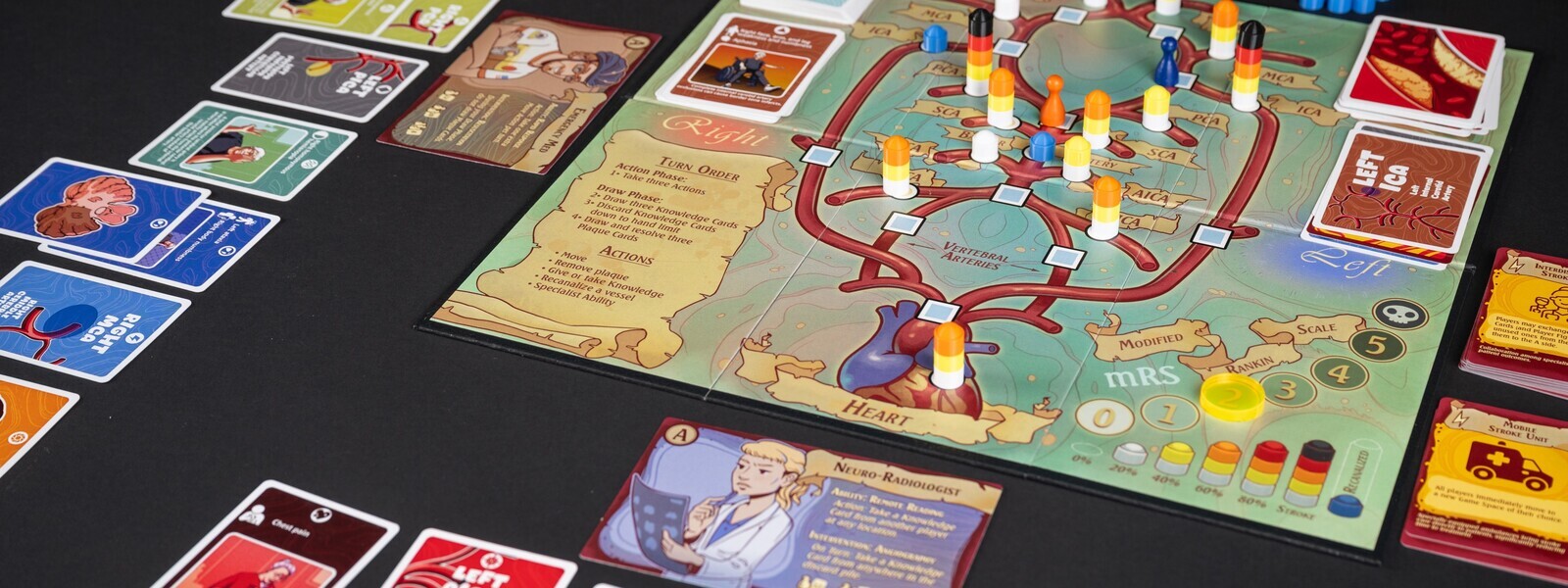 Circle of Willis is a cooperative strategy game that combines medical science, pattern matching, and crisis management as players scramble to unblock the arteries in Willis’s head and restore blood flow to his formidable brain. Players must spend a limited pool of actions each turn to move around a networked map and manage escalating crises in a race against a deck-driven timer toward a shared victory.