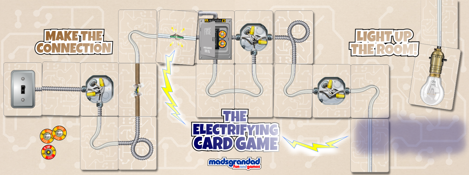 Players collect card tiles and try to build a working electrical circuit, complete with Switch, Fuse Panel, and a Light Bulb Socket.