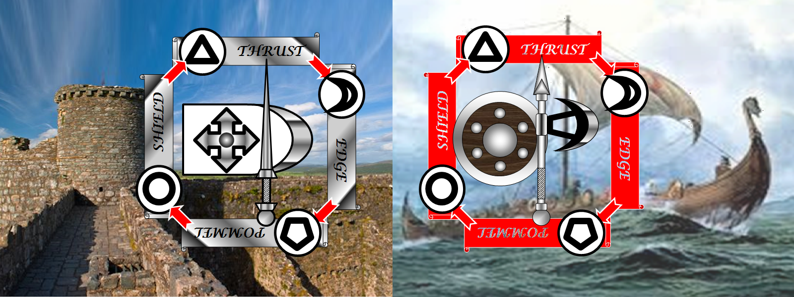 How to Play Each player begins with 5 attack cards. These attack cards have 1 attack type on each edge of the card. Each attack type has an icon and a name. These are: Triangle/Thrust, Eclipse/Edge, Pentagon/Pommel and Sphere/Shield.