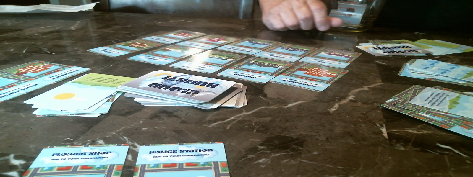 There are 2 types of cards in this card game - Weather Cards and Community Cards. Each player is trying to collect Community Cards to build their Community, while playing Weather Cards against other players or to help themself.