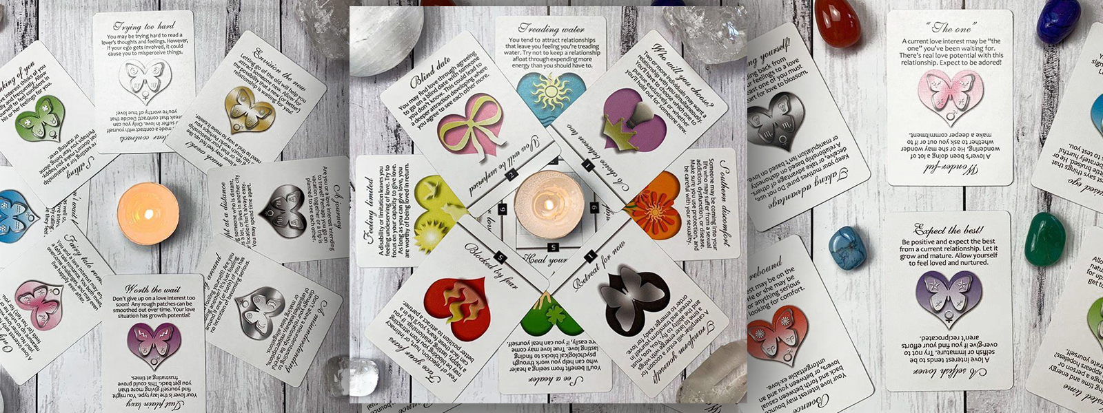 The first deck, The Color of Love, consists of 72 cards which can be used to read a love interest's intentions or where a current romance is going (or if it will happen). The second deck, The Color of New Love, consists 72 cards which can be used to read new love relationships that may come onto the horizon. Also included in this kit are a pendulum chart for reading eye and hair color, first initial, and to answer yes/no questions.