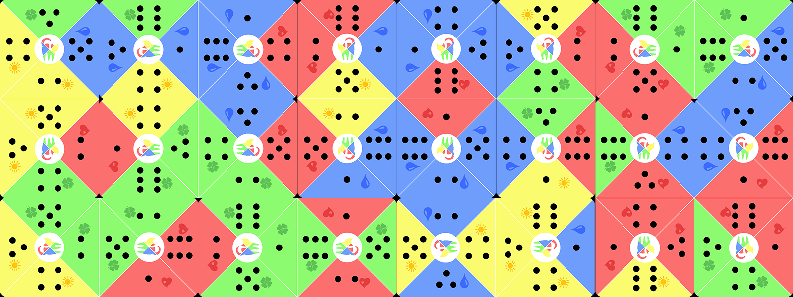 In this colorful game you play one card each turn. Each card makes the "game board" a little bigger. Every card has to match its neighbors, either in color or in number of dots. Depending on the rule-set you use, you either score points directly by playing your card, or you get to place a pawn that will help you claim a territory. Each territory you have claimed this way will score you points later on in the game.