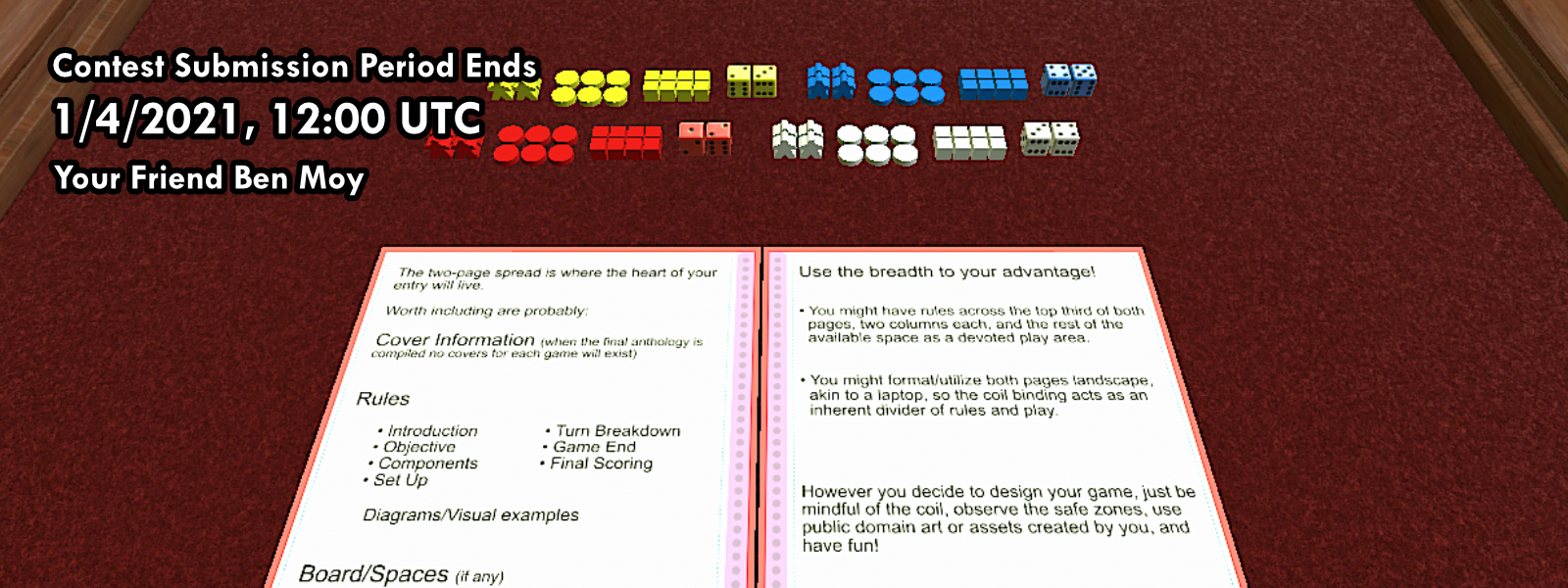 Great for manipulating pieces within the two-page limitations of the contest rules (and adding a few more prototype bits to your personal collection).