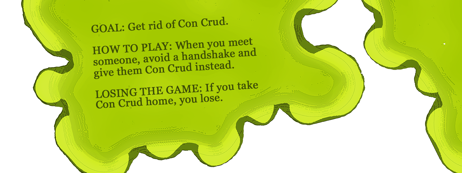 At the convention, players will give their Con Crud cards to the people they meet. This can be secretly or open (each approach will achieve different results). The person who received Con Crud must now pass it to another person or else they will lose the game as the rules state "If you take Con Crud home, you lose."