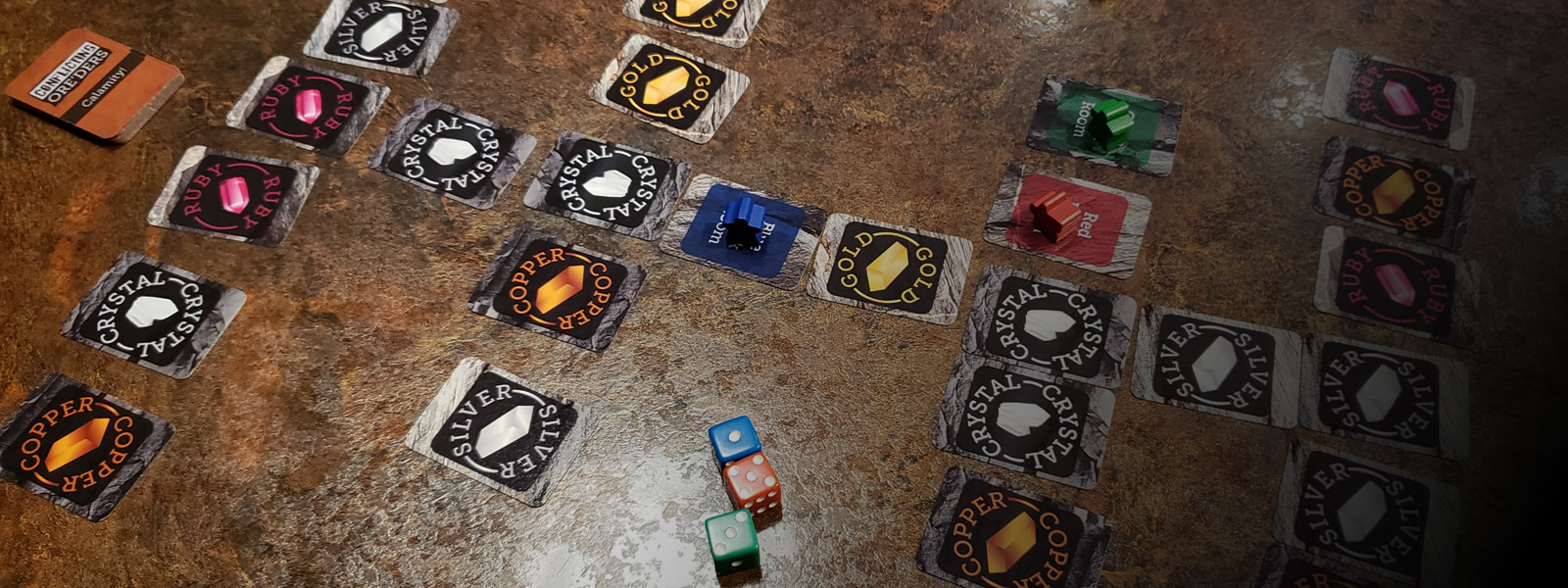 Players take turns rolling dice, moving 2 of the 3 miner meeples, playing calamities and collecting ore until one pile has all been mined. All workers and extracted ore are shared, that is, there is a single collection of ore that all players are contributing towards.