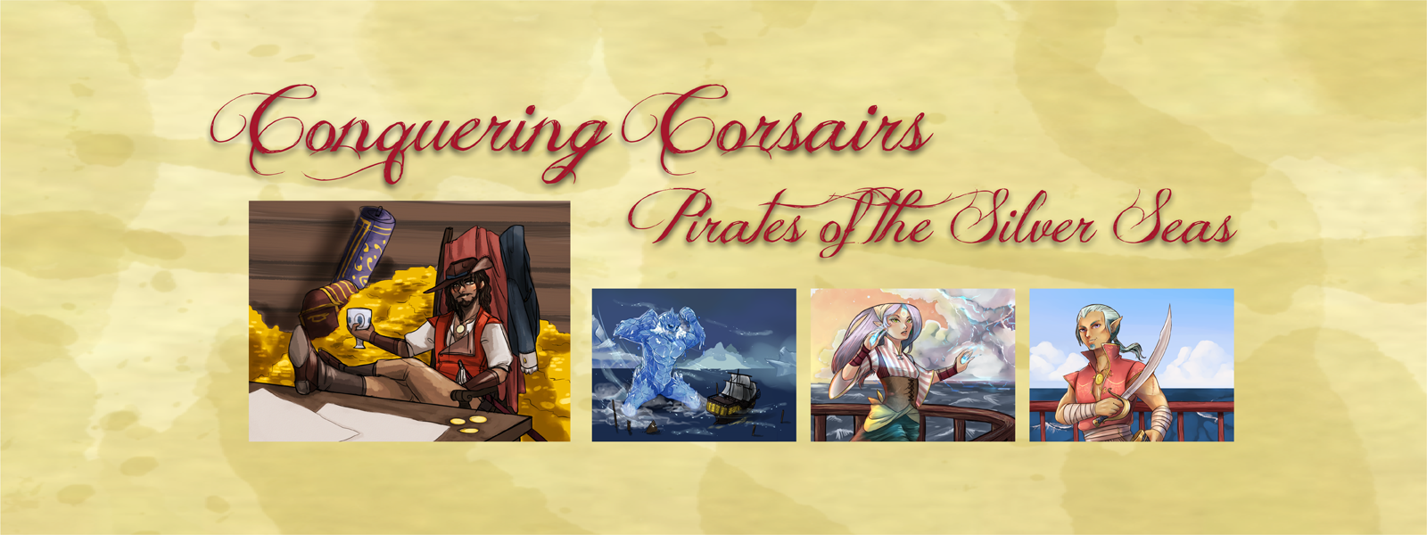 Conquering Corsairs is a card game in which you take the role of pirates, trying to gain treasure and prestige to become the most feared and famous ship to sail the Silver Seas. You will take your ship to strange and dangerous locations, recruit new crew members to your cause, do battle, and put plunder in your hold!