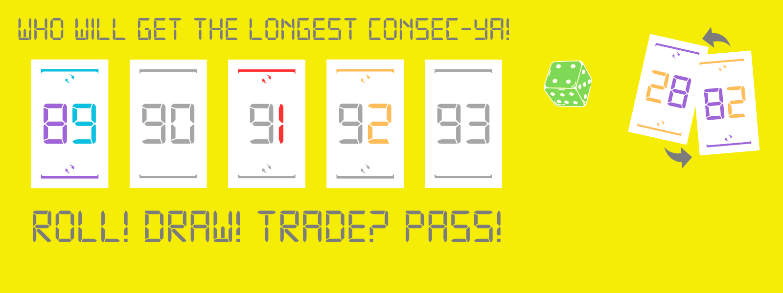 Consec-ya! is the simple card game of “Consec-ya”tive numbers. Roll the die, draw a card, make a trade, and pass the die! Be on the lookout for rotatable cards and wild cards! Make clever but bold trades! Hurry before the first draw pile runs out! Will having the longest Consec-ya! be enough to win? Or will you need multiple Consec-ya!s? Let’s play Consec-ya!