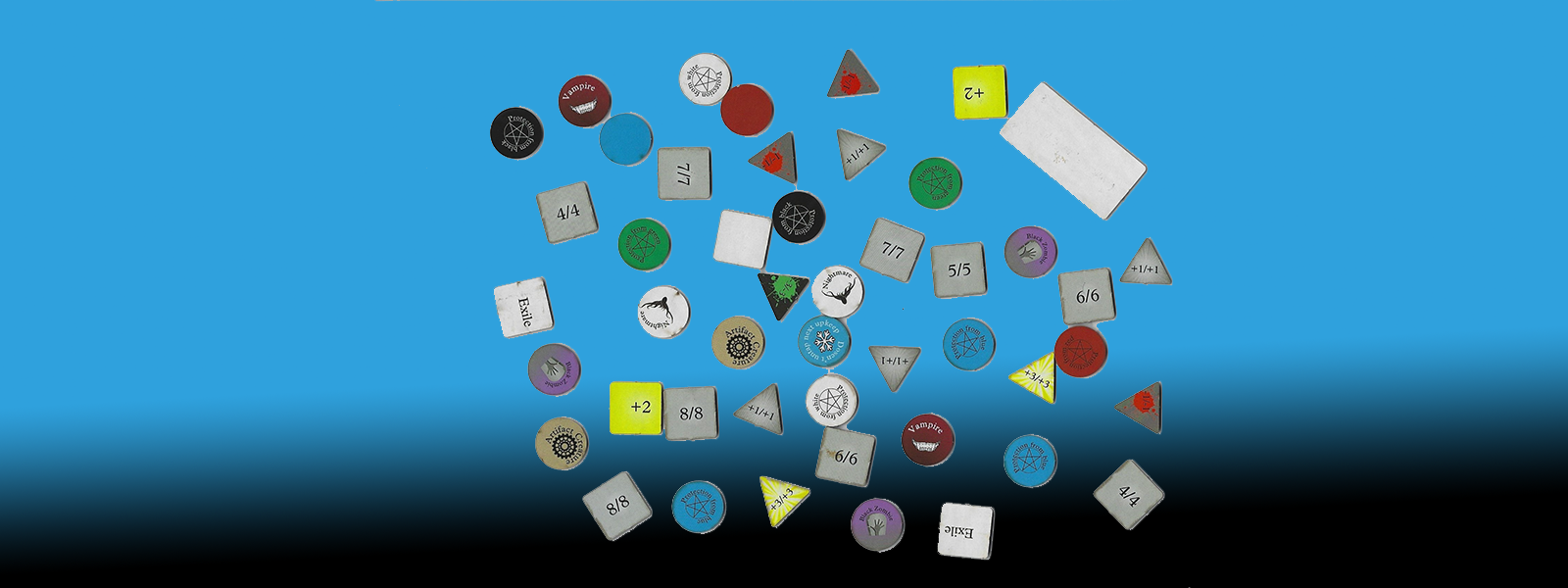45 +1/+1 /// -1/-1 reversible triangle counters. 15 +3/+3 /// -3/-3 reversible triangle counters. 45 Circular "status" counters including "is a black zombie", "protection from White", etc. 30 Square 'trackers' to keep tabs on loyalty, charges, sizes, etc. 4 extra big blank 'domino tiles' to put your own notes on.