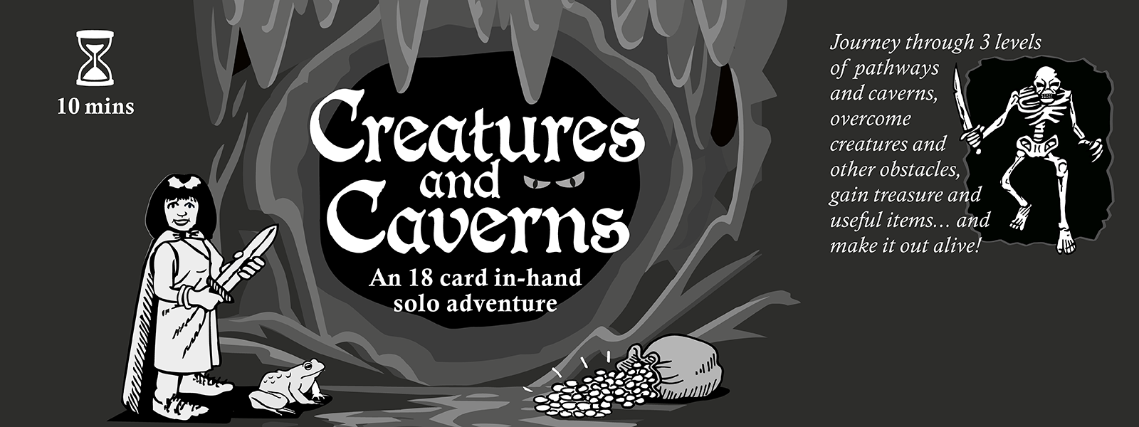 Creatures and Caverns is a solo game consisting of just 18 cards and is played completely in-hand.