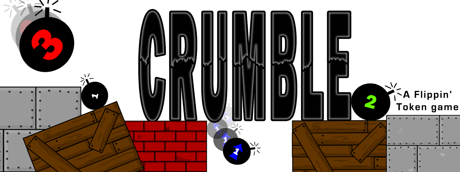 A game for all ages, easy to learn, hard to master, and lots of fun to play! Wall cards are placed in the center, and you have to flip bomb tokens onto the walls to break them. Flipping's done in the same way you'd flip a coin to determine heads or tails. There's different strengths of walls, and different kinds of bombs to help take it down. Landing the bomb on multiple cards, using arrow bombs, and stacking tokens, are some of the ways to Crumble the wall in a hurry.