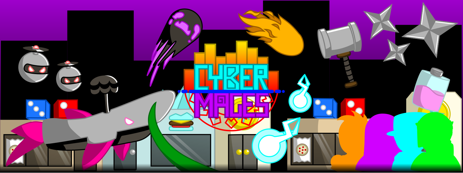 Cyber Mages is cyberpunk themed game where you and your friends can team up to harness the elements and take down a powerful dystopian empire. Travel across their cities, battling bosses, eating pizza, and collecting spells to shift and swap your arsenal as you go.