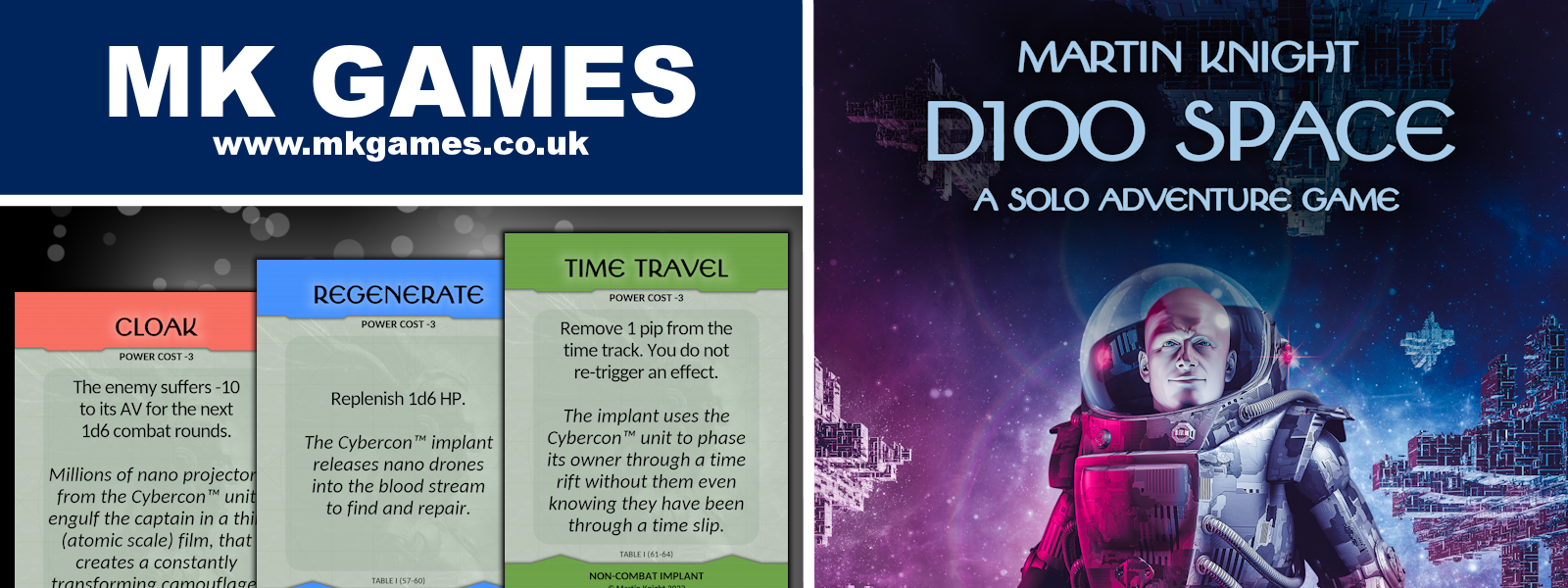 D100 Space Implants and Patches contains 25 Implant cards found on table I - Implants from D100 Space, 5 bonus Implant cards, and 5 bonus Enemy Cards. Also included is a reference card with information of how to use the cards in your games.
