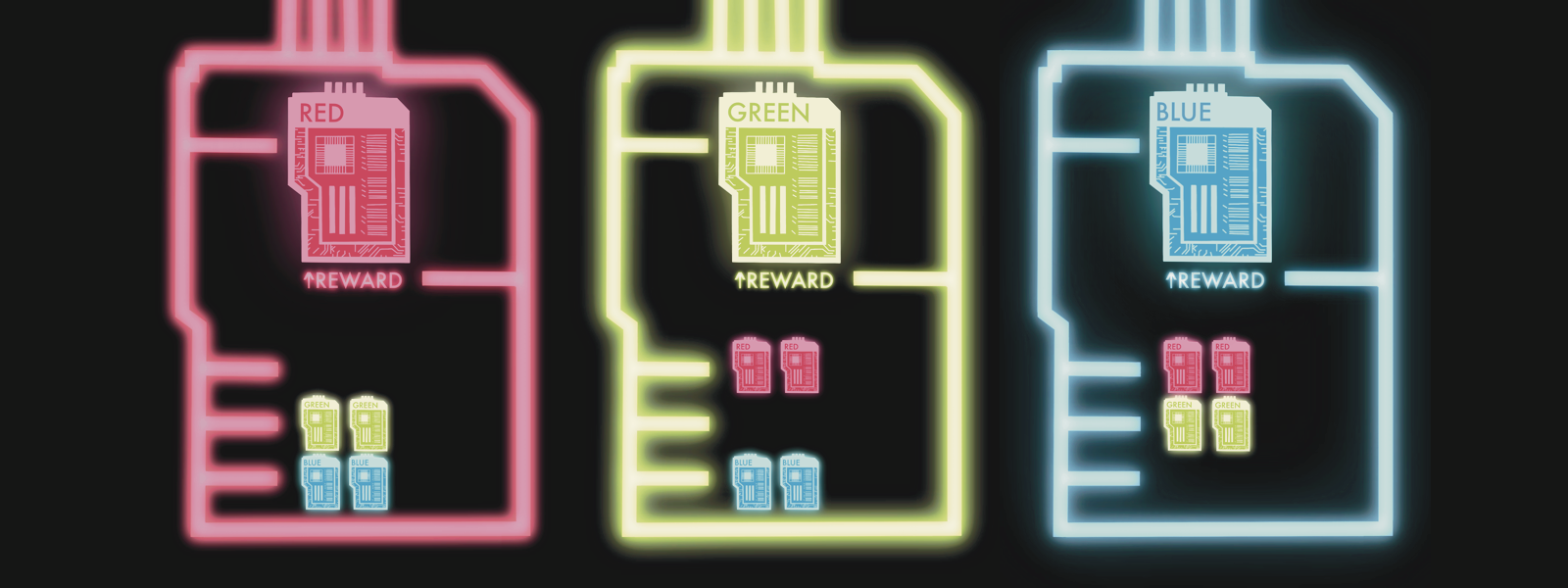 A "Data Chain" occurs when a player purchases multiple cards in a single turn. Chain your purchases together and potentially buy all 4 cards in the Data Row! Each card has a cost located on the bottom half of the card which will show how many chips of each color it takes to purchase the card. Each card also shows a reward on the top half of the card which is taken when the card is purchased. If this is your first purchase of the turn, take 1 chip of that color from the bank. If this is the second card you’ve purchased this turn, take 2 chips of that color, etc.